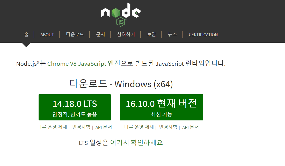 먼저 구글에 nodejs 서치해서 가장 최신 버전 다운로드하기.