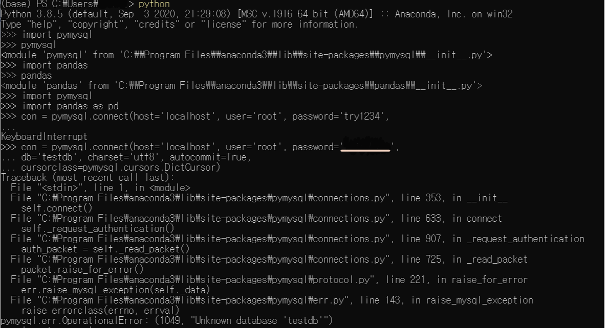 cmd창인 Anaconda Powershell Prompt에서 pip install pymysql 실행을 하니까 정상적으로 설치가 됐다.